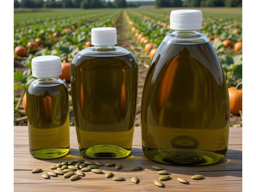 Olej dýňový lisovaný za studena ze semen dýně olejné.