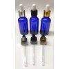 Skleněná lahvička se skleněným kapátkem pro kosmetické aplikace se šroubovacím hrdlem v šesti barevných kombinacích kapátka.