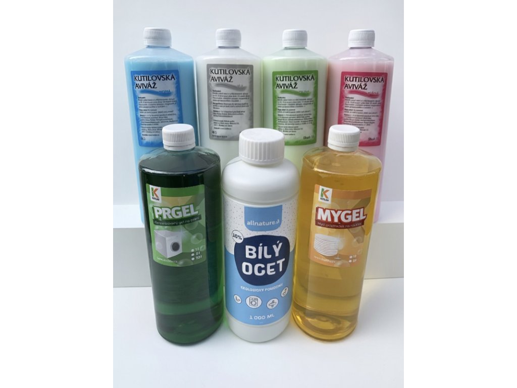 Bílý ocet 10% (1 litr) + Prací gel - PrGel (1 litr) + Mycí gel MyGel (1 litr) + Aviváž Kutilov - dle výběru (1 litr)